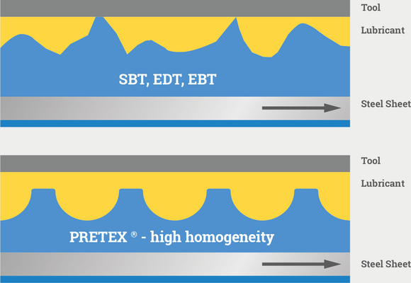 An uniform distribution of the lubrication pockets and an uniform lubrication transport in the contact area between the tool and the sheet is just as decisive. Tests of various surface structures have proven that Pretex® texturized steel sheets reduce friction and transfer highest blank holder forces without appearance of cold fusing between tool and sheet surface. The deep drawing working area suitable for producing finished parts without wrinkles and fractures is thus extended.