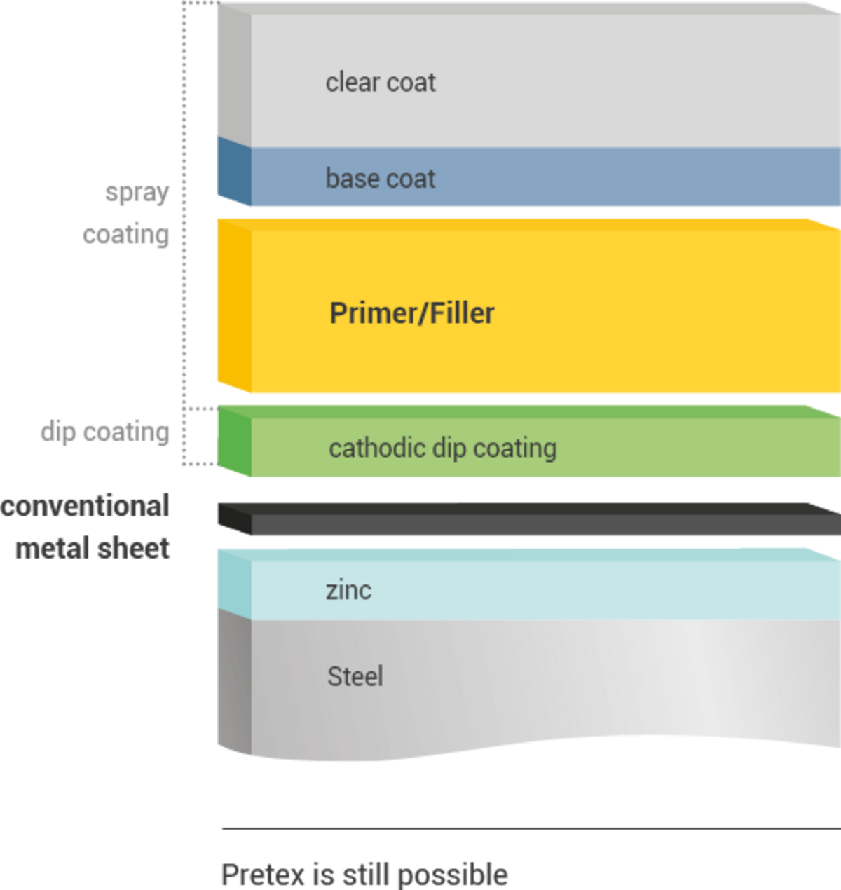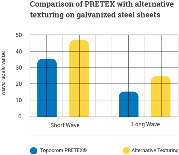 Due to the uniformity as well as the excellent waviness values a painting process without filler is possible for the metal sheet structured with Topocrom. This leads to thinner paint layers and cost savings.