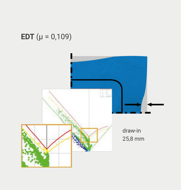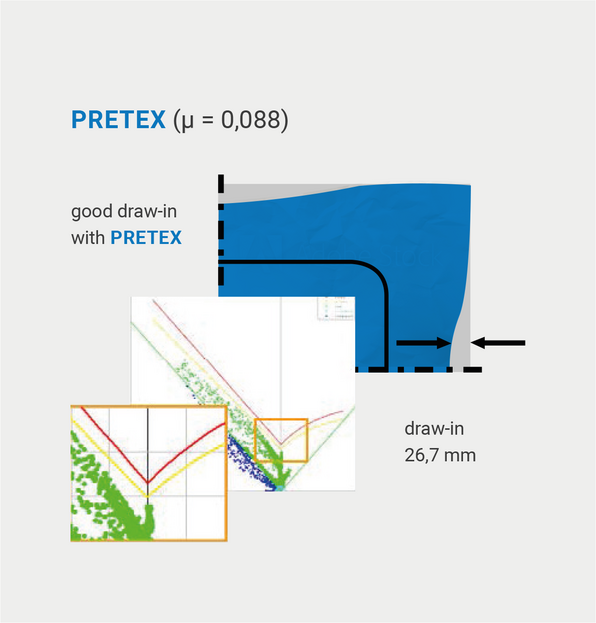 An uniform distribution of the lubrication pockets and an uniform lubrication transport in the contact area between the tool and the sheet is just as decisive. Tests of various surface structures have proven that Pretex® texturized steel sheets reduce friction and transfer highest blank holder forces without appearance of cold fusing between tool and sheet surface. The deep drawing working area suitable for producing finished parts without wrinkles and fractures is thus extended.