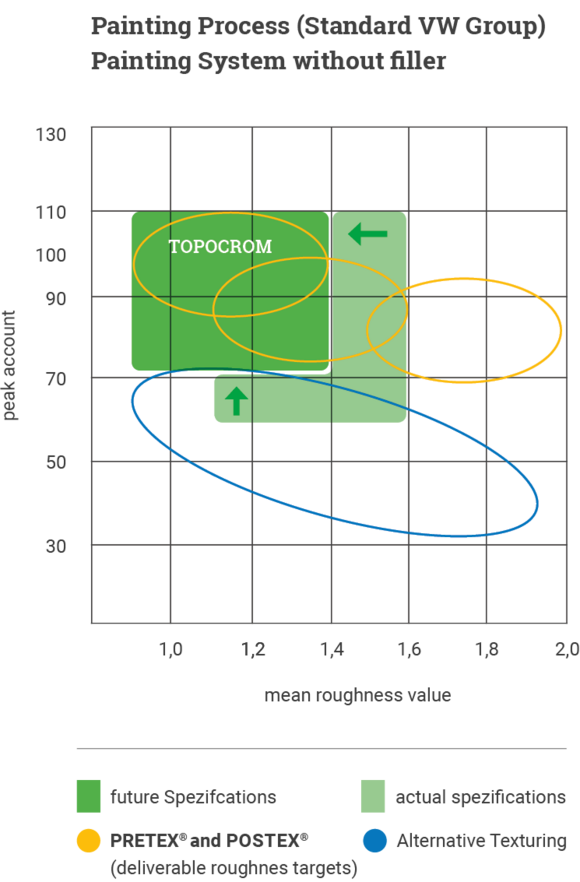 Due to the uniformity as well as the excellent waviness values a painting process without filler is possible for the metal sheet structured with Topocrom. This leads to thinner paint layers and cost savings.